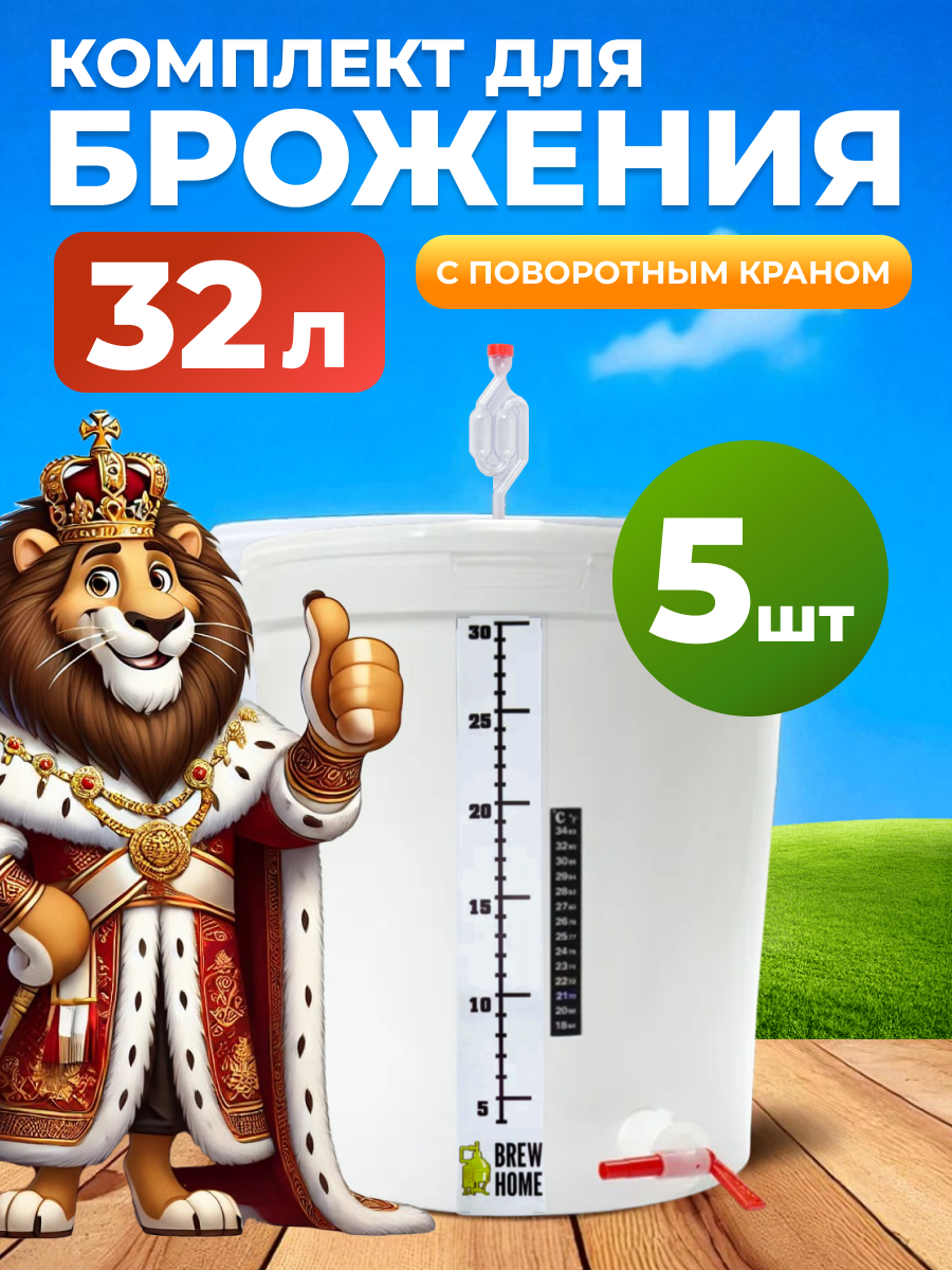 Емкость для брожения на 32л. с гидрозатвором, краном 3/4 поворотным, термометром и мерной шкалой, 5шт